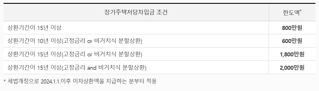 이자상환액 전액 소득공제가되며, 장기주택저당차입금 이자상환액 공제금액과 주택임차차입금 원리금상환 공제금액 및 주택마련저축 공제금액의 합계액이 아래 금액을 초과할 수 없음