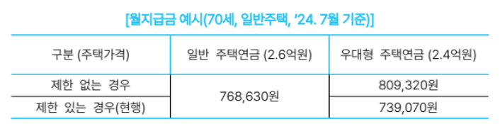 우대형 주택연금의 월지급금은 2.5억원을 기준으로 한 일반 주택연금의 월지급금을 초과하지 못하도록 제한하고 있습니다. (2.5억원에 가까운 우대형 가입자가 주택가격이 2.5억원을 초과하여 우대형에 가입하지 못한 분에 비해 더 높은 월지급금을 받는 상대적 차별 문제를 방지하기 위함)