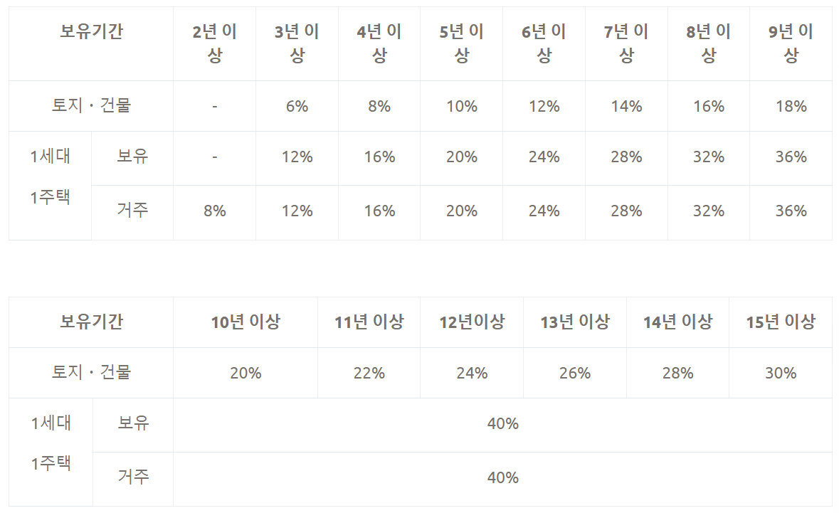 일반적으로 3년 이상 보유 시 6%, 그 이후 보유 기간이 1년식 늘어날 때마다 2%씩 상승하게 됩니다. 15년 이상을 보유하게 되면 30%까지 공제 받으실 수 있습니다.